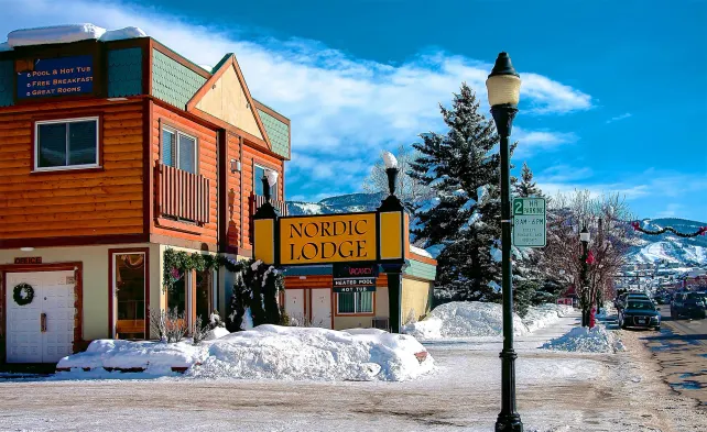 Cozy motel in Steamboat Springs with convenient amenities and a fireplace in the lobby.