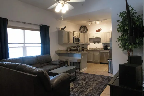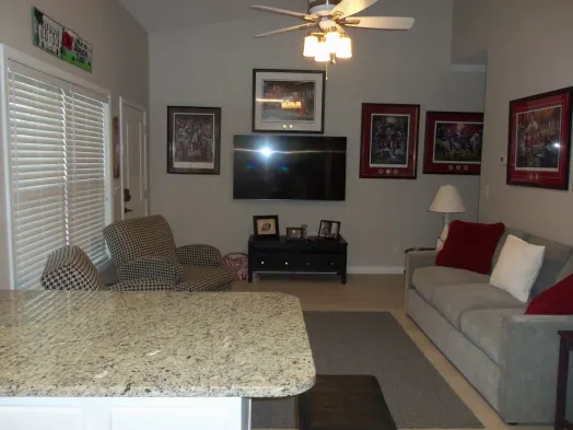 Two-bedroom condo with outdoor pool, fitness facilities, and smart TVs, perfect for game-day weekends near UA campus.