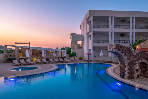 All-inclusive hotel with seasonal outdoor pool, restaurant, and complimentary breakfast near Faliraki Beach.
