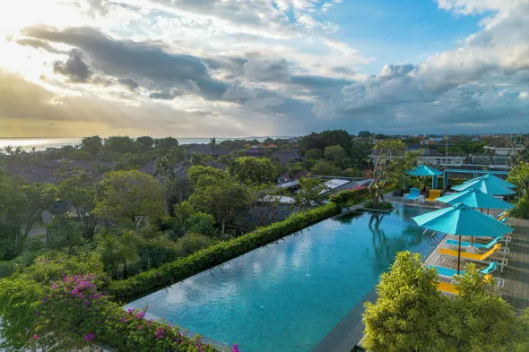 Luxury hotel with a full-service spa, outdoor pool, and steps from Kuta Beach in vibrant Legian, Bali.