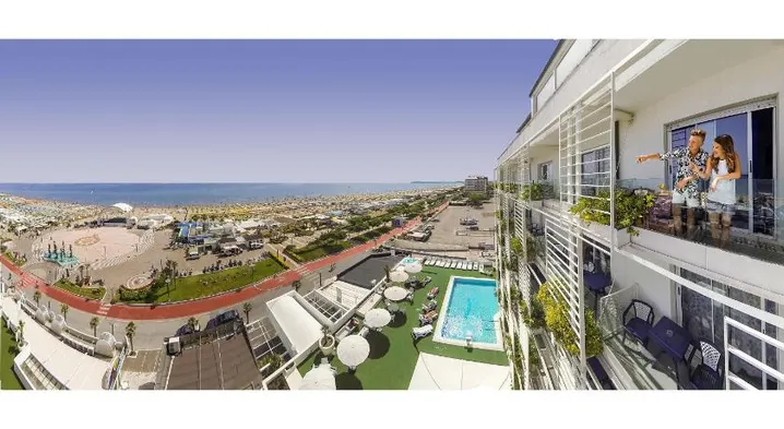 Beach hotel with private beach access, terrace views, and complimentary breakfast near Riccione Beach.