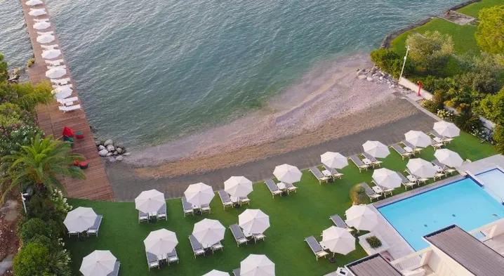 Luxurious aparthotel with outdoor and indoor pools, full-service spa, and private beach access in Sirmione.