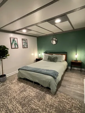 Charming carriage house in Midtown Atlanta with cozy queen bed, versatile sleeping options, and luxury neighborhood ambiance.