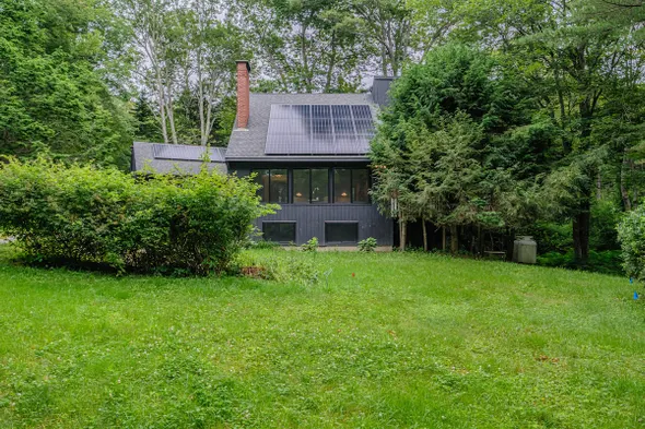 Modern cabin with large windows, luxurious bathroom, kitchenette, and outdoor seating area by the fire in serene Freeport.