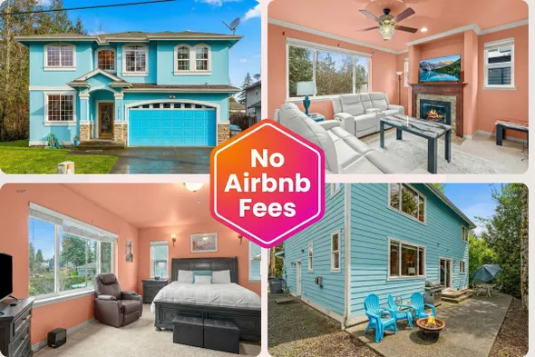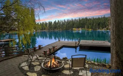 Cozy bungalow by Lake Tapps with private beach access, outdoor fireplace, and terrace for a peaceful getaway.