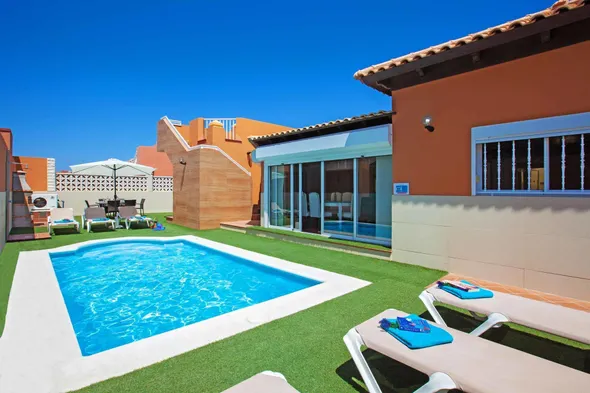 Stunning vacation home with private outdoor pool, garden, and sea views, just a short walk from the beach in Corralejo.