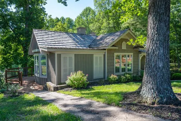 Cozy cabin nestled in the woods.
