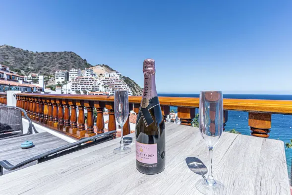 Oceanfront villa with panoramic views, large balcony, swimming pool, and luxury amenities in Avalon, California.