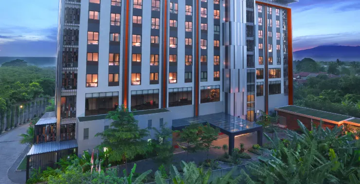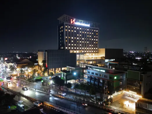Luxury hotel with outdoor pool, sauna, fitness center, and three restaurants near Resinda Park Mall in Karawang.