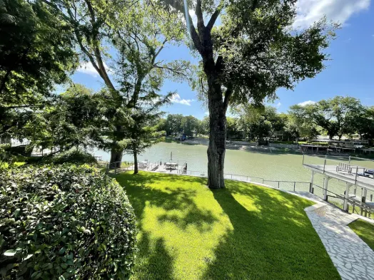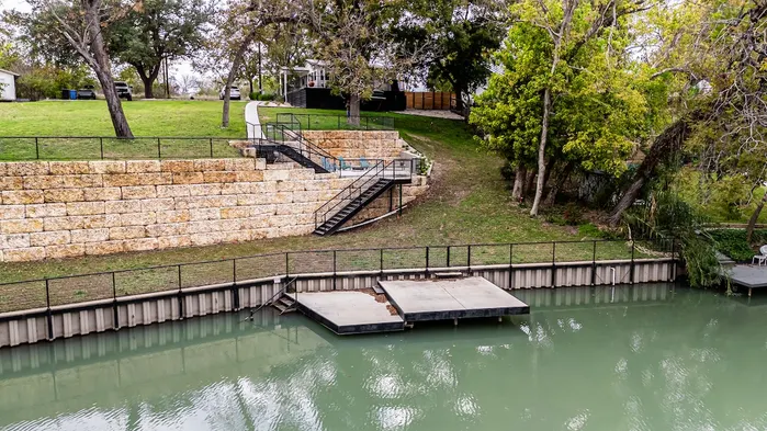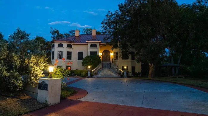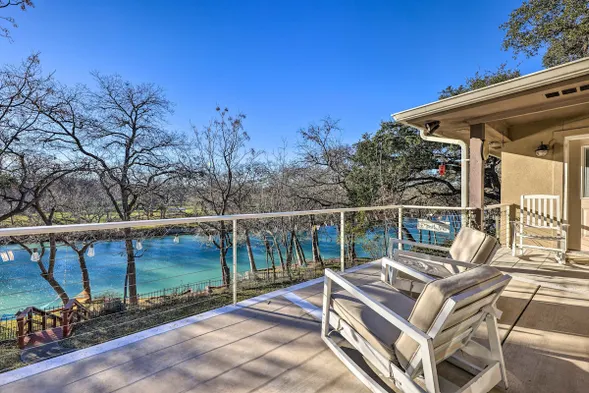Experience a luxurious riverfront oasis with spacious outdoor areas and stunning oak trees in Seguin, Texas.