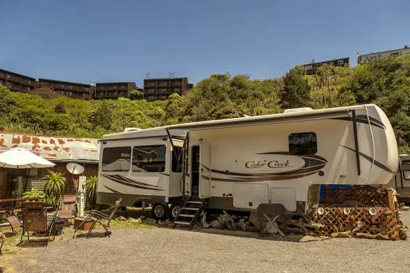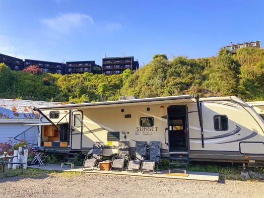 Luxury glamper in historic Noyo Harbor with unique decor and custom-made mattresses for a comfortable stay.