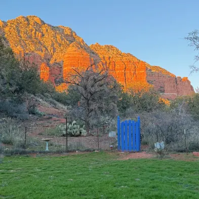 Private vacation home with a fireplace, garden, and access to hiking trails in scenic Sedona.