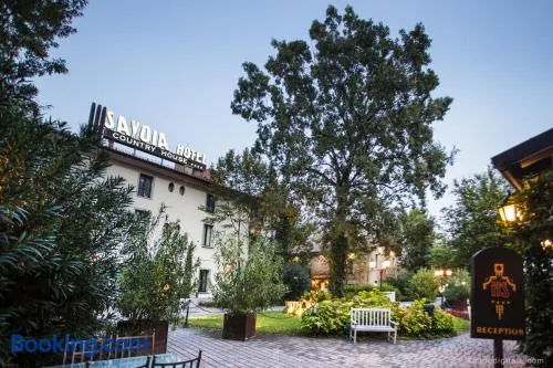 Experience luxury at this Bologna hotel with a spa, hot tub, steam room, and on-site restaurant for a relaxing getaway.