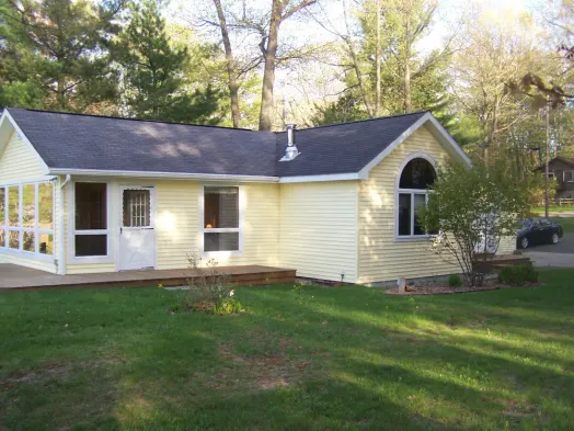 Waterfront cottage with private dock, fire pit, and central air conditioning in Ludington, Michigan.