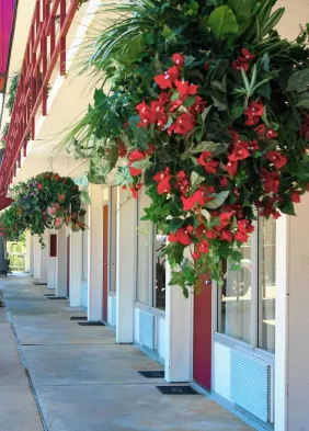 Cozy hotel with air-conditioned rooms, private balconies, and a garden in Eureka Springs historic district.