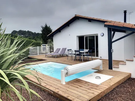 Superb air-conditioned wooden villa in the Arcachon Basin forest, 10 minutes from the beach, heated swimming pool