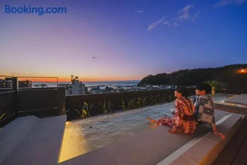 Experience hot springs and a rooftop terrace at this charming ryokan in Izu, surrounded by nature and tranquility.