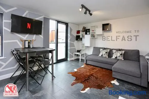 Centrally located apartment with a terrace and garden, featuring kitchens and flat-screen TVs for a comfortable stay in Belfast.