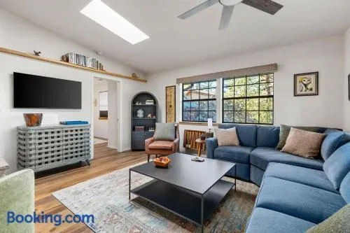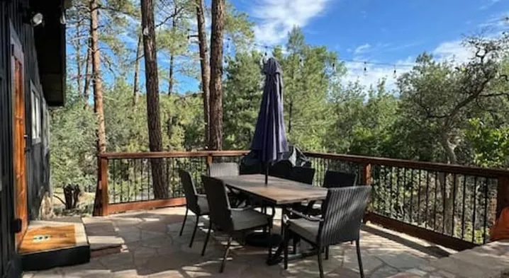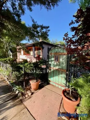 Cottage with a garden, terrace, and outdoor fireplace, centrally located in Prescott near Whiskey Row and Yavapai County Courthouse.