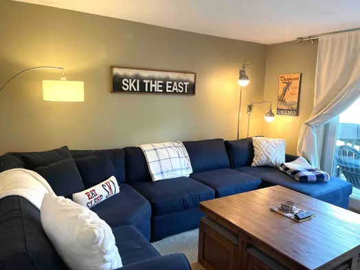 Cozy adults-only condo with electric fireplace, kitchenette, and shuttle stop across the street for easy access to Okemo Mountain Resort.