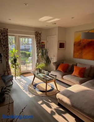 Chalet close to Heathrow T5, Windsor Castle, Legoland, Thorpe Park, with off road parking, free Wifi, private garden, spacious & fully equipped, cozy wood burner & comfy sofa, ideal for exploring London with trains to Waterloo, a beautiful unique retreat