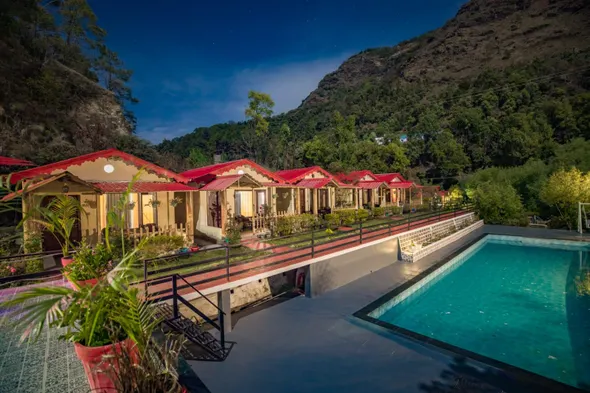 Hotel with swimming pool, business center, and family rooms in Pangot, Uttarakhand, near Kotabagh Waterfall.