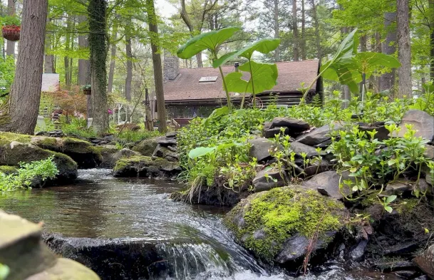 Rustic Rest Log Cabin, with hot tub and trout stream, near Poconos attractions.