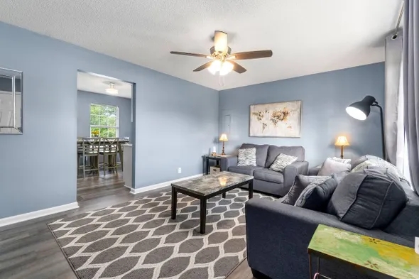 Cozy townhouse with two bedrooms, full kitchen, and outdoor patio, just minutes from local attractions in Clarksville.