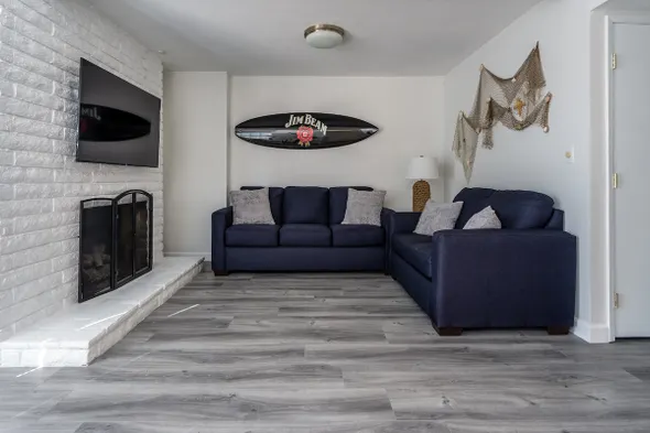 Modern beach guest house with fully equipped kitchen, living room, and close proximity to beaches and water activities.