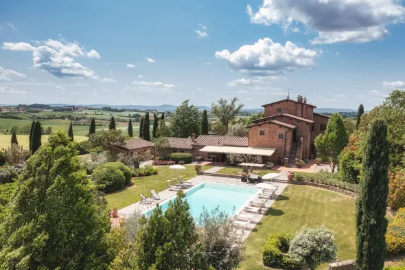 Luxury hotel in Cortona with outdoor pool, spa services, and a renowned restaurant serving local cuisine.