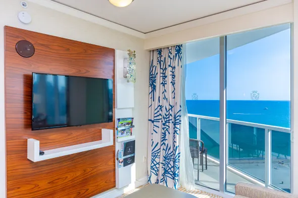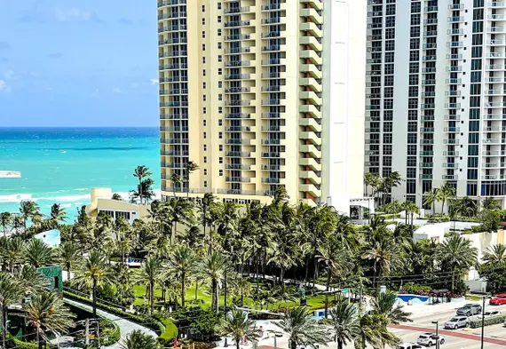 Oceanfront resort with direct beach access, kitchenette, and outdoor pool in Sunny Isles Beach.