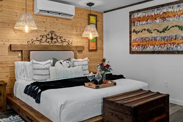 Cozy cabin with a jetted tub, fireplace, and private porches in Fredericksburg's historic district, perfect for adults only.