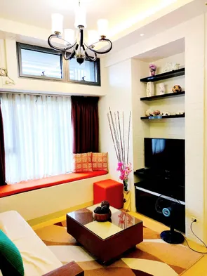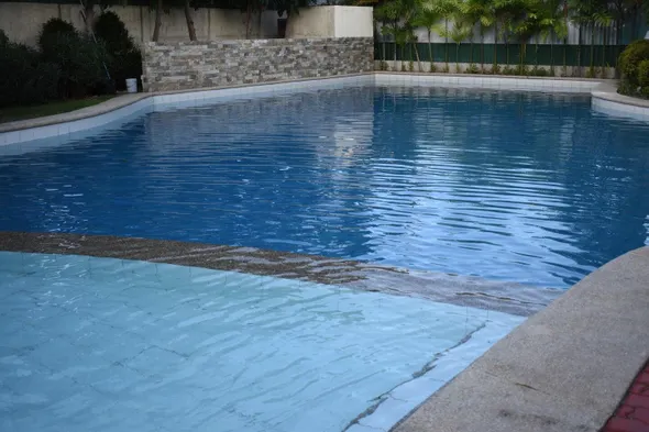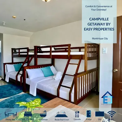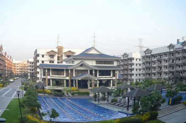 Luxury apartment with outdoor pool, kitchen, and laundry service in Muntinlupa City.