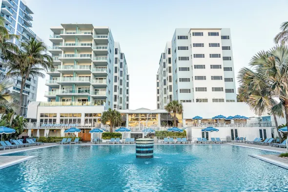 Experience luxury with stunning ocean views, 3 outdoor swimming pools, and a beachfront restaurant in Surfside.