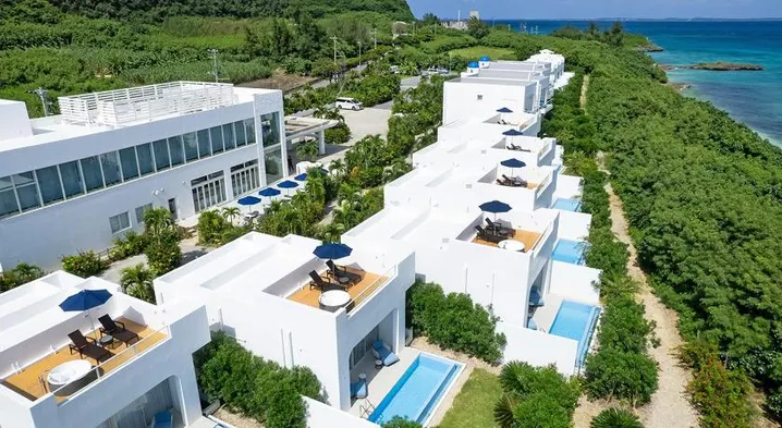 Luxury spa hotel with private pools, outdoor swimming pool, and dining options near Kuura Mizube Park in Miyakojima.