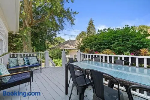 Spacious vacation home with 5 bedrooms, 2 kitchens, and a garden near Lake Michigan and local shopping.