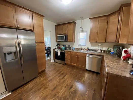 Spacious vacation home with 5 bedrooms, 2 kitchens, and a garden near Lake Michigan and local shopping.