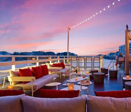 Luxury spa hotel with seasonal outdoor pool, free beach shuttle, and fine dining options in Stone Harbor.
