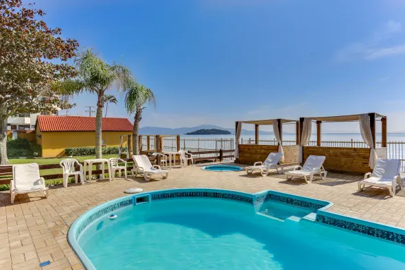 Beachfront hotel with 4 hot tubs, outdoor swimming pool, and a restaurant with pool views in Canasvieiras, Florianópolis.