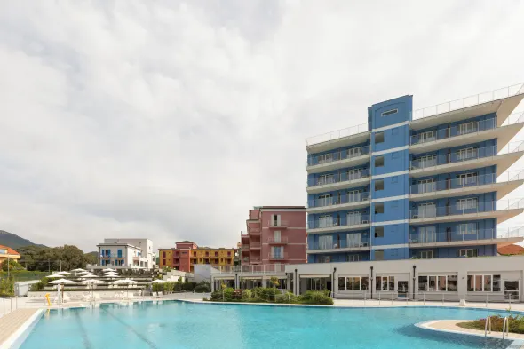 Family-friendly aparthotel with outdoor swimming pool, tennis courts, and on-site dining in Loano.