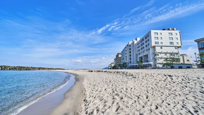 Relax in a luxurious ryokan with hot springs, private balconies, and free self-parking near Kaike Onsen Beach.