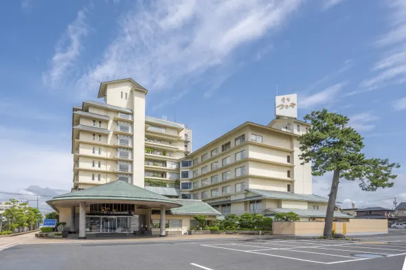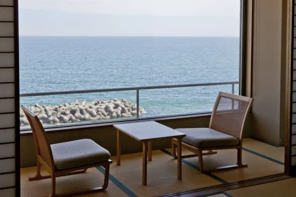 Relax in a luxurious ryokan with hot springs, private balconies, and free self-parking near Kaike Onsen Beach.
