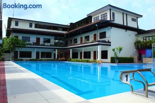 Relax in a spa hotel with swimming pool, multiple dining options, and free parking in Las Pinas, just minutes from shopping centers.