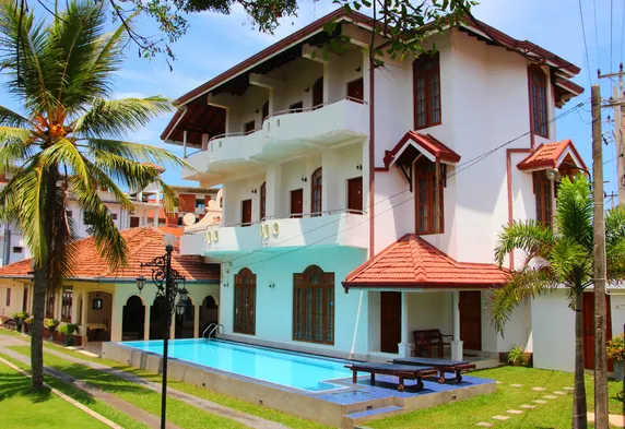 Boutique hotel with outdoor pool, restaurant, and air-conditioned rooms near Negombo Beach.