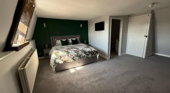 Luxury apartment in Melksham with a stunning bathroom, electric fire, and complimentary breakfast box. Enjoy a 20% discount at the on-site restaurant.