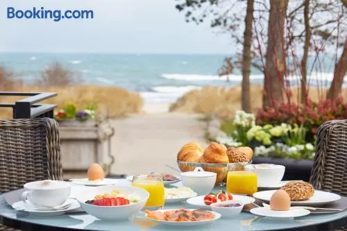 Luxury beach hotel with full-service spa, indoor and outdoor pools, and two restaurants in Timmendorfer Strand.
