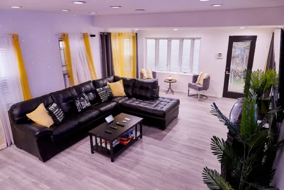 Recently renovated studio suite with stylish décor, 50-inch smart TV, and laundry service near UBS Arena.