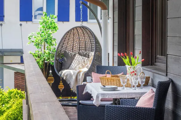 Individual 40 sqm attic apartment with open roof truss and balcony access