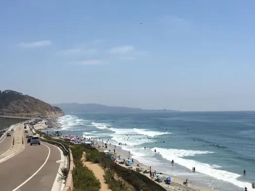 Beachfront motel with air-conditioned rooms, refrigerators, and complimentary wifi in Del Mar, California.